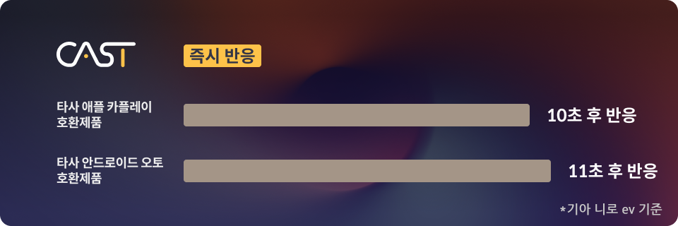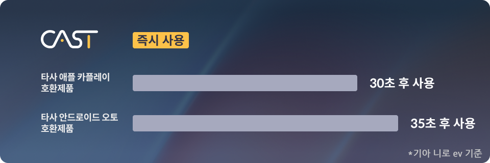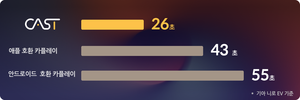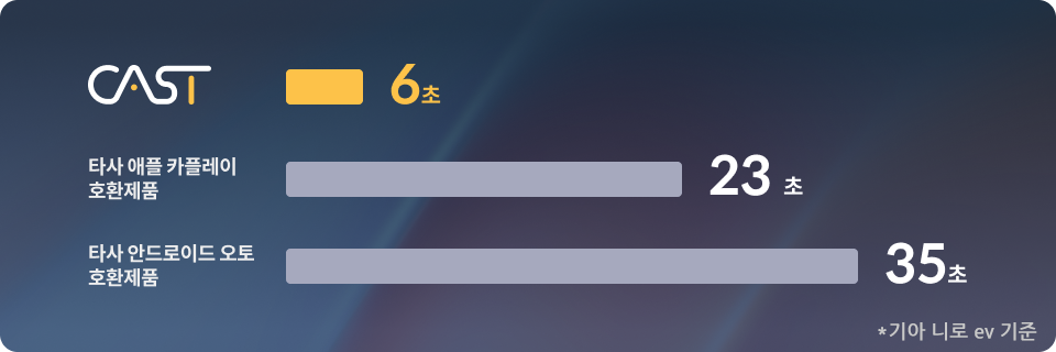 안드로이드 호환 경쟁 모델A는 35초, 카플레이 호환 모델 B는 23초, 캐스트는 6초로 측정되었습니다.